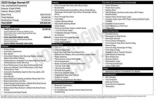 Outfitted with a 2.0L I4 DOHC engine and 9-speed automatic transmission, the Hornet GT delivers a thrilling 21 city/29 highway MPG performance. Elevate your driving experience with the available TRACK PACK, featuring red brake calipers, bright pedals, dual-mode suspension, and sporty leather steering wheel. For added comfort, the COLD WEATHER GROUP includes a heated steering wheel and front seats, ensuring you stay cozy in any climate.